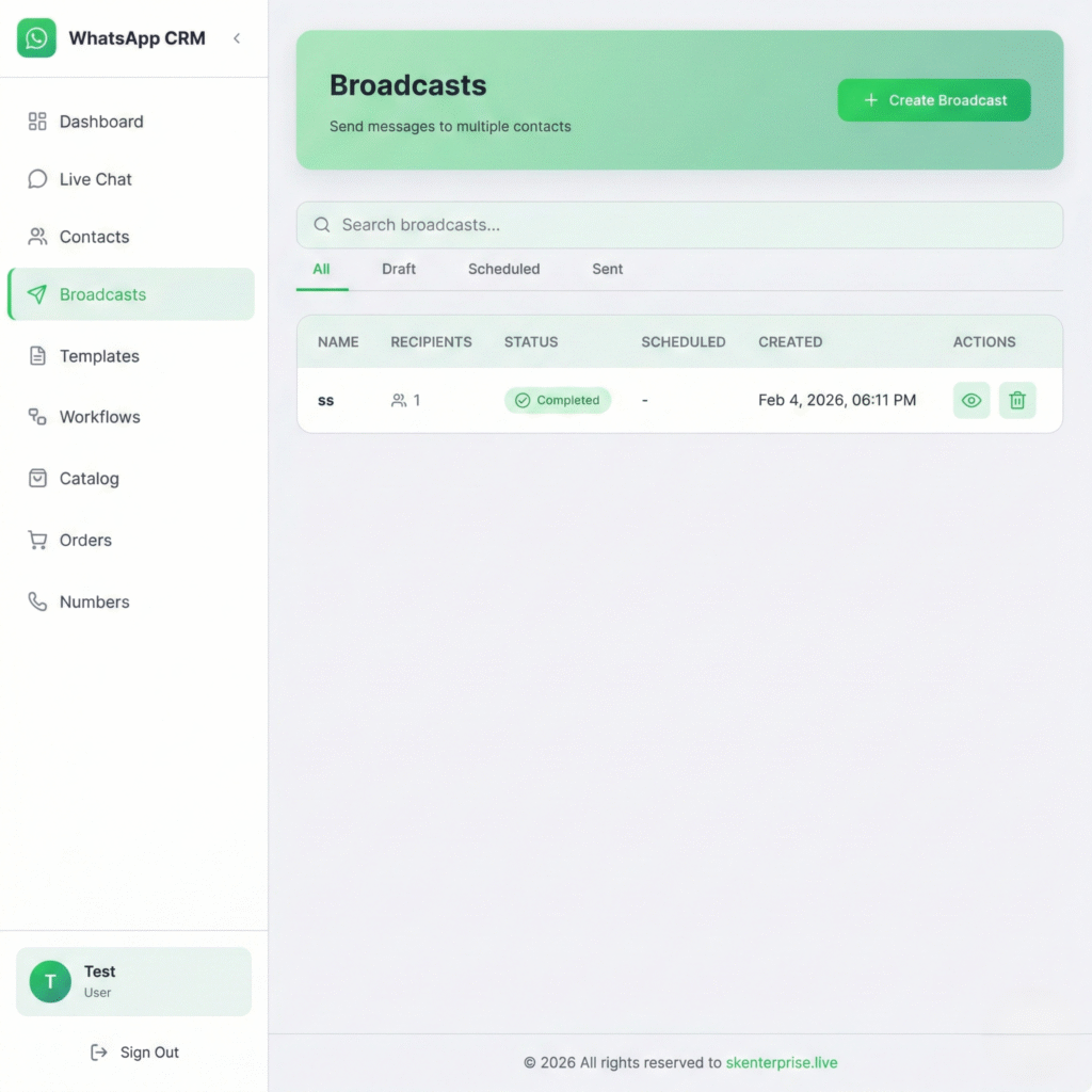 You can manage live 1:1 customer chats, send broadcast messages using approved templates, showcase product catalogues, handle orders, and automate conversations using AI chatbots — all from one centralized dashboard.